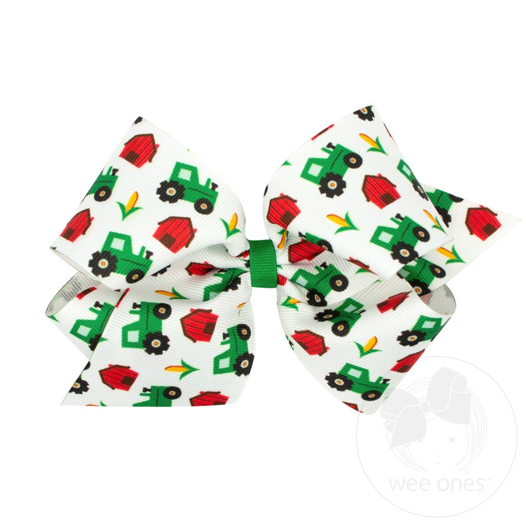Add a touch of farm charm to your little girl's hair with this king-sized grosgrain bow featuring a playful tractor. Perfect for country outings (or just a day at the barn)! Moo-ve over boring hair accessories, this bow is udderly cute! This bow is sure to stay in her hair all day with our patented WeeStay™ no-slip hair clip.
